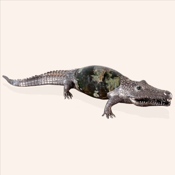 Crocodile with natural chrysoprase stone application and dipside stone eyes.